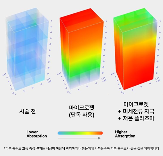 마이크로젯, 미세전류 자극, 저온 플라즈마의 세 가지 기술이 함께 작용하면서 피부 흡수력이 크게 향상되고, 보습·결·톤·모공 등 전반적인 피부 상태 개선에 도움을 줍니다. 바늘을 사용하지 않아 통증과 멍이 적고 회복이 빠르며, 민감하거나 얕은 부위에도 부담 없이 적용할 수 있어 스킨부스터나 앰플 전달에 효과적입니다.